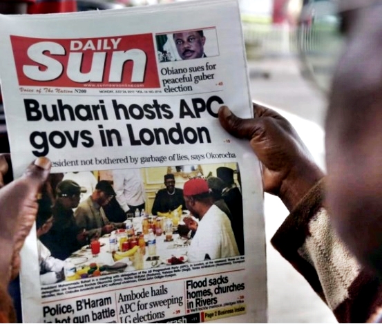 A man in Lagos, Nigeria, reads newspaper headlines, including a story about President Muhammadu Buhari