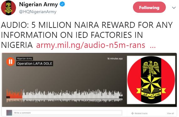 The Nigerian army has offered as much as N5 million to anyone who has information on bomb factories in the Northeast.