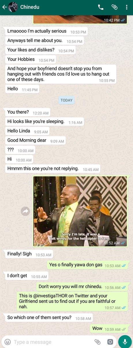 Screenshots of the Whatsapp chats from the investigation revealed how the lady's boyfriend was tested and he failed woefully.