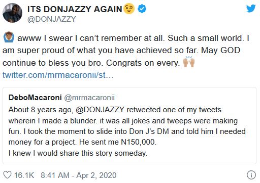 He wrote on Twitter: “About 8 years ago, @DONJAZZY retweeted one of my tweets wherein I made a blunder. it was all jokes and tweeps were making fun. I took the moment to slide into Don J’s DM and told him I needed money for a project. He sent me N150,000. I knew I would share this story someday.